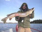 I got out with Bill this morning on Lake Charlevoix. We started off at 4:00 am on the North arm and trolled for two hours with no success. Water temps running 39 degrees. We picked up and ran to the south arm just after daylight and found warmer water at 48 degrees. On the first pass we managed an 18 inch walleye that hit a blueberry muffin reef runner. Then after a couple of smallmouth and a couple of lost fish we picked up another walleye again about 18 inches on a shad rap. The highlight of the day however was just before we pulled lines at 10 am. Bill managed to wrestle this nice northern to the boat that took a husky jerk. A little chilly out there today but it sure was nice to get back out again, it has been too long!